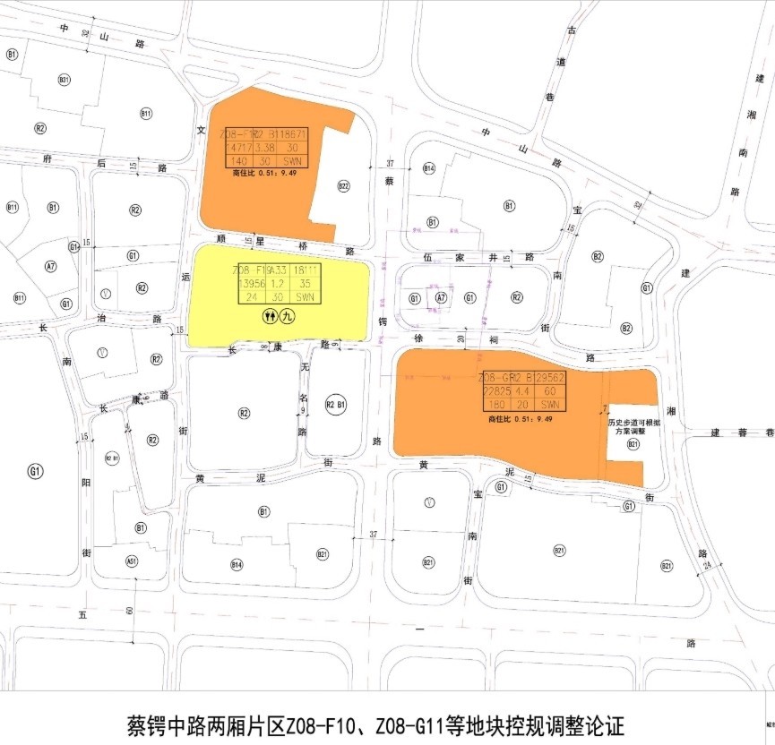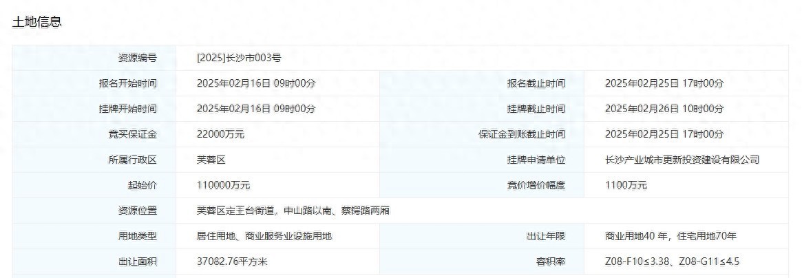 交易信息显示,003号地块位于芙蓉区定王台街道,中山路以南、蔡锷路两厢,规划为居住用地、商业服务业设施用地,出让面积为37082.76㎡,起始价110000万元。地块由Z08-F10、Z08-G11两幅宗地构成。