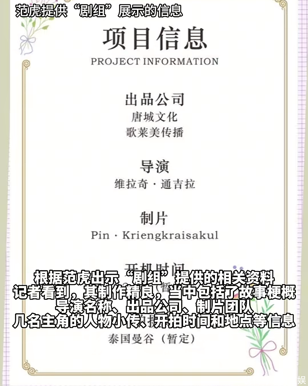从这里开始,范虎感到了不对劲儿,可剧组各方面资讯都非常专业,谈的片酬也很合理,提供的进组告知,人物梗概,角色小传和剧组照片都看不出任何问题。